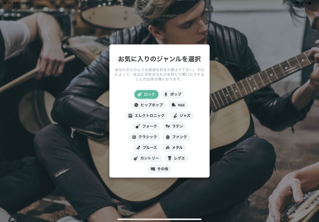 ニックネーム、音楽に関しての質問を適当に選び、通知が必要なら「オンにする」をタップすれば、初期設定は完了。