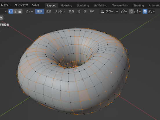 Ctrl+TABでサークルカーソルを出したまま編集モード/Oでプロポーショナル編集をオン/GでDonutぽく凸凹をつける(最初はプロポーショナルの範囲が広い場合があるので、マウスのローラーを手前に転がして適当に範囲を狭める)/上選択/ランダム選択/Sで動かすと選択部を凸凹にする事が出来るがESCでキャンセル(機能の紹介のみw)/