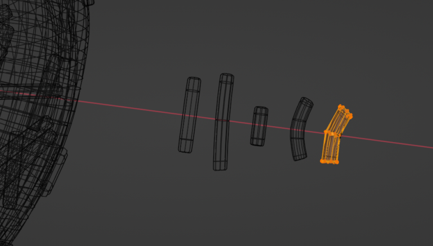 同様に短いタイプ、孤の字に曲がったタイプ、少しお辞儀したタイプ等、5種類作る(5種類くらいの形があればリアルに見せる事が出来るので、どんな形でも良い)/編集モード/Gでモデルの中心点(オレンジ色)にメッシュを合わせる/