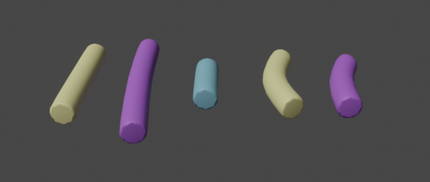 円柱/Ctrl1でモディファイアの細分化(Subdivision)を追加出来る/TABで編集モード/CtrlRで線分に中間点を追加する/クリック/ –Y側に寄せる/CtrlR /クリック/+Y側に寄せる/オブジェクトモード/右クリック/スムーズシェード/右円柱をSprinkleへ名称変更する/TAB/Z/ワイヤーフレーム/ShiftDで横にコピーを作る/コピーしたSprinkle.001を選択/TAB/Ctrl+R/その場でクリック/片方を選択/Gで少し曲げる/