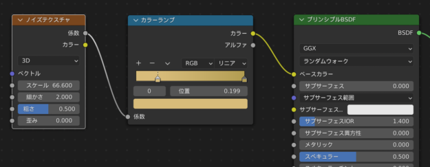 Shift+A/入力/テクスチャ座標をノイズテクスチャ左に配置/テクスチャ座標オブジェクト=ノイズテクスチャベクトル/ノイズテクスチャ/スケール:60 /ノイズテクスチャ係数=プリンシプルノーマルを繋ぎ、そこにShift+A/ベクトル/バンプを挿入/バンプノーマルから高さへ繋ぎ直す/距離:0.002 /ノイズテクスチャ細かさ:5.5 /