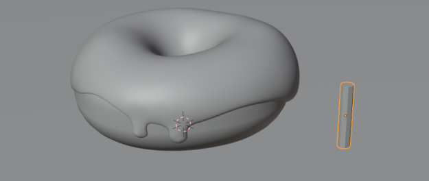 上Shift+A/メッシュ/円柱/左下の円柱を追加を開き、頂点:8、半径 : 0.01、深度 : 0.1 /GでDonutの横に移動させる/Icing /下Shift+A/インスタンス/ポイントにインスタンス作成(オブジェクトを添付するNode)/面にポイント配置ポイント=ジオメトリ統合ジオメトリ間へ挿入/右Collection内の円柱を下Nodeへドラッグ&ドロップ /オブジェクト情報ジオメトリ=ポイントにインスタンス右側インスタンス/面にポイント配置の密度変更:150で円柱が添付される/R /X軸:90° /Ctrl+A /回転で反映/