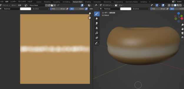 Shift+A/テクスチャ/画像テクスチャをノイズテクスチャ上に配置/画像テクスチャカラー=プリンシプルベースカラーを繋ぐとカラーランプとの繋ぎが解除される/カラーランプ削除/画像テクスチャの新規をクリック/□512 /名前をDonut Base /カラーをDonut色へ/アルファのチェック解除/OK /上Texture Paint /左上半径:40、強さ:0.3 /帯状に白をペイントしDonutを揚げた時の色むらを演出/左上画像/名前を付けて保存で保存する/