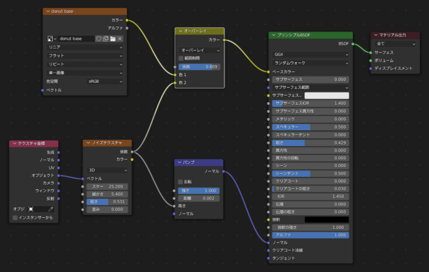 Shading /Shift+A/カラー/ミックスRGB /Donut Base=プリンシプル間へ挿入/ノイズテクスチャ係数を色2と繋ぐ/ミックスのミックスをオーバーレイ /係数:0.4 /ノイズテクスチャスケール25 /