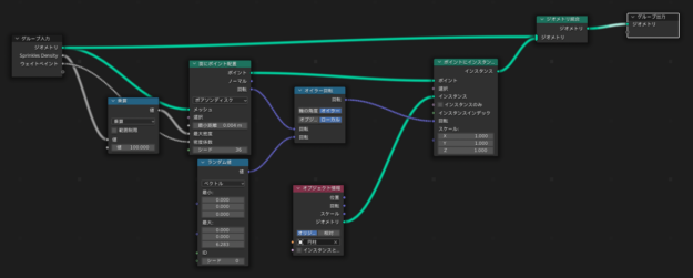 面にポイント配置ランダムをポアソンディスク/左の乗算は削除/最小距離:0.004m /最大密度:600 /グループ入力/N /グループ/上から2個目をWeight Paint 、3個目をSprinkles Densityへ名称変更/上下マークで2個目と3個目の順番を変える(上からGeometry、Sprinkles Density、Weight Paint)/グループ入力Sprinkles Density=面にポイント配置最大密度 /グループ入力Weight Paint=面にポイント配置密度係数/グループ入力Sprinkles Density =面にポイント配置最大密度間へShift+A /ユーティリティ/数式/追加を乗算へ/値:100 /右モディファイアプロパティ/Sprinkles Density :10 /