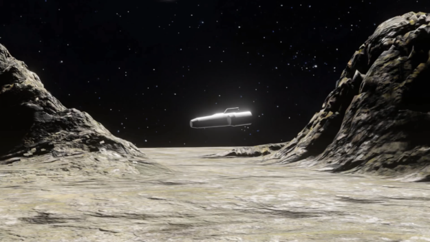 宇宙船を簡単に作る(立方体や他のモデルでも良い)>Shift+A>カーブ>パス>編集モード>端の頂点を選択>右クリック>スナップ>カーソル→選択物>オブジェクトモード>宇宙船>右クリック>スナップ>選択物→カーソル>パスと宇宙船を選択>右クリック>ペアレント>パスに追従>パス>編集モード>2点選択>右クリック>細分化で頂点追加してパスをウェーブさせる>右オブジェクトデータプロパティ>パスアニメーション>フレームの数値を変更してスピードを調整>フィールドへ配置