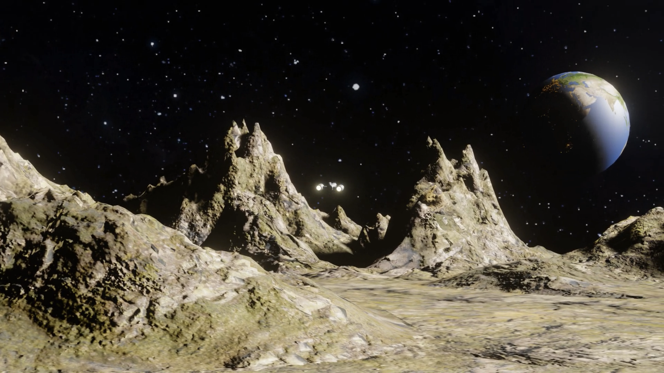 Shift+A>メッシュ>UV球>右クリック>スムーズシェード>Z>マテリアルプレビュー>上Shading>プリンシプルBSDF>Ctrl+Shift+T>地球のマップ4枚をセット(Cloudsは無しで良い)>下反転左カラーをスペキュラー右カラーと繋ぎ直すと海に艶が出る>係数:0.5>Shift+A>コンバータ>カラーランプをラフネス右に追加>カラーランプカラーとプリンシプルBSDF放射に繋ぐ>Shift+A>コンバータ>数式をカラーランプ左に追加>加算を累乗へ>ラフネスカラーと累乗ベースを繋ぐ>累乗値とカラーランプ係数を繋ぐ>カラーランプの黒を3分の1まで右にずらす>白をオレンジにする>右レンダープロパティ>プルームONで放射設定が発光する>出来た地球を山の近くに配置>